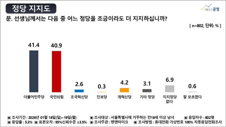 조사 결과 민주당 지지도는 41.4%, 국민의힘은 40.9%로 집계됐다. 두 정당 간 격차는 0.5%포인트다.