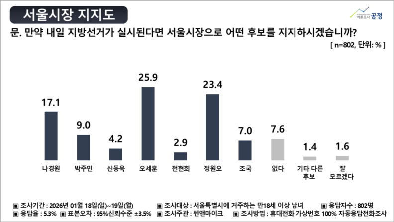 조사 결과 오세훈 후보는 25.9%로 1위를 기록했고, 정원오 후보가 23.4%로 뒤를 이었다. 나경원 후보는 17.1%로 나타나 상위 두 후보를 추격하는 위치에 자리했다. 이어 박주민 9.0%, 조국 7.0%, 신동욱 4.2%, 전현희 2.9% 순이었으며, ‘지지 후보 없음’은 7.6%였다.