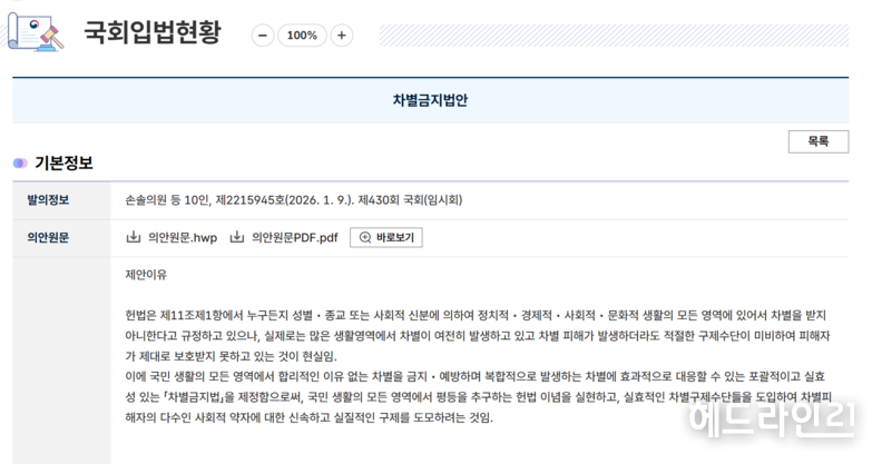 손솔 의원 등이 발의한 해당 법안은 성별, 성적 지향, 성별 정체성 등을 이유로 한 차별을 금지하는 내용을 골자로 한다. 그러나 법조계와 시민단체 일각에서는 법안의 구체적인 조항들이 사회적 합의가 이루어지지 않은 개념을 법제화하려 한다며 강력히 반발하고 있다.
