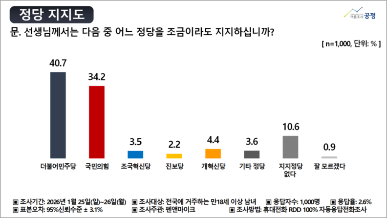펜앤마이크가 여론조사 전문기관 여론조사공정(주)에 의뢰해 지난 25~26일 전국에 거주하는 만 18세 이상 성인 남녀 1,000명을 대상으로 실시해 27일 공개한 조사 결과에 따르면, 정당 지지도는 더불어민주당 40.7%, 국민의힘 34.2%로 집계됐다. 조국혁신당은 3.5%, 개혁신당은 4.4%, 진보당은 2.2%였으며, 기타 정당은 3.6%로 나타났다. ‘지지 정당 없음’은 10.6%, ‘잘 모르겠다’는 0.9%였다.