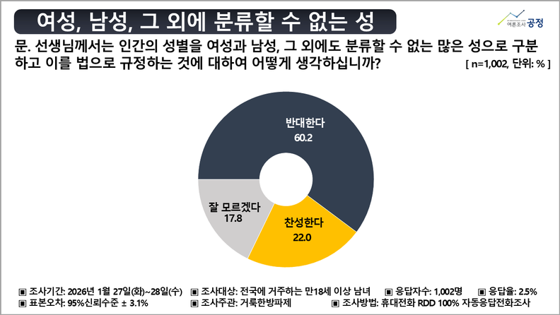 여론조사공정이 거룩한방파제통합국민대회의 의뢰로 실시한 ‘차별금지법 관련 국민 인식 조사’ 결과, 여성·남성 외 성별을 법적으로 인정하는 데 대해 ‘반대한다’는 응답이 60.2%로 집계됐다. ‘찬성한다’는 응답은 22.0%에 그쳤고, ‘잘 모르겠다’는 응답은 17.8%로 나타났다.