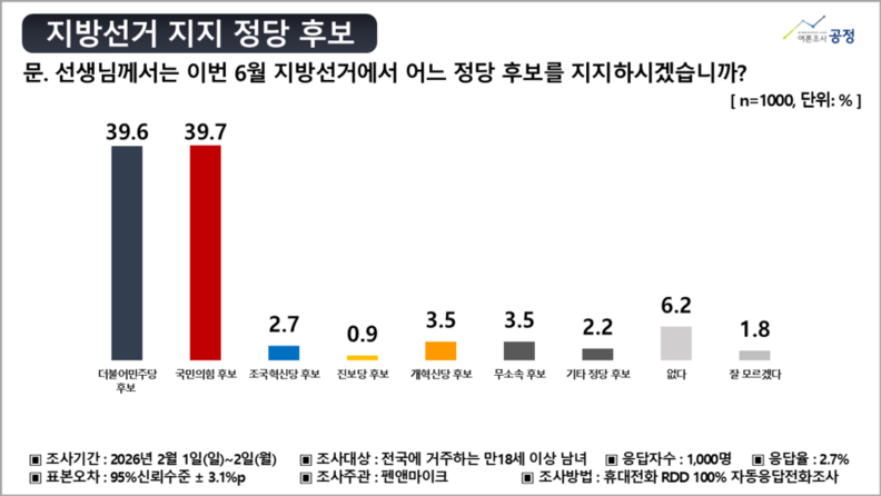 펜앤마이크가 여론조사 전문기관 여론조사공정(주)에 의뢰해 지난 1일과 2일 이틀간 전국에 거주하는 만 18세 이상 남녀 1천명을 대상으로 지방선거 지지 정당 후보를 조사한 결과, 더불어민주당 후보는 39.6%, 국민의힘 후보는 39.7%로 집계됐다.
