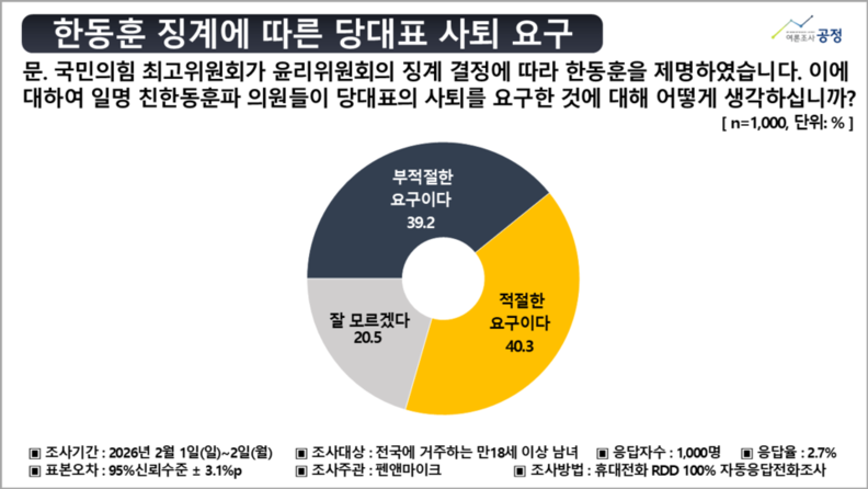 펜앤마이크가 여론조사 전문기관 여론조사공정(주)에 의뢰해 지난 1일과 2일 이틀간 전국에 거주하는 만 18세 이상 남녀 1천명을 대상으로 친한계의 장 대표 사퇴 요구에 대한 인식을 물은 결과, ‘적절한 요구’라는 응답은 40.3%, ‘부적절한 요구’는 39.2%로 집계됐다. ‘잘 모르겠다’는 응답은 20.5%였다.