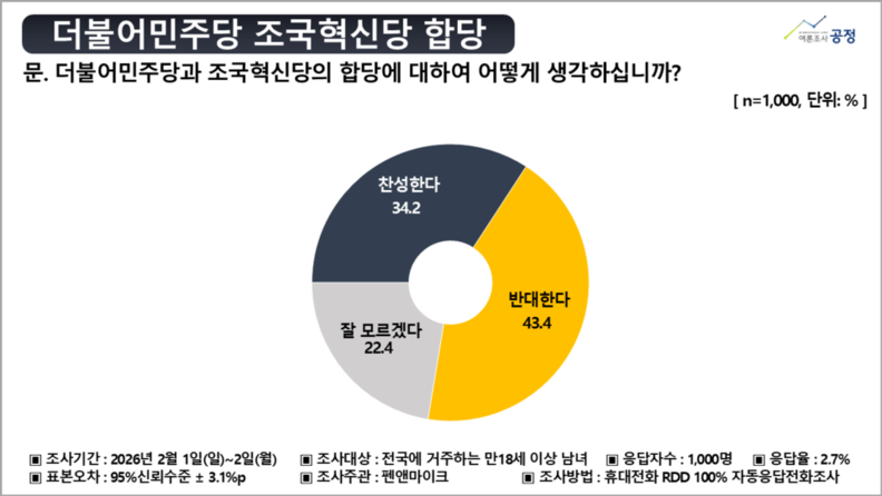 펜앤마이크가 여론조사 전문기관 여론조사공정(주)에 의뢰해 지난 1일과 2일 이틀간 전국에 거주하는 만 18세 이상 남녀 1천명을 대상으로 양당 합당에 대한 의견을 물은 결과, 반대한다는 응답이 43.4%로 찬성 34.2%를 오차범위 밖에서 앞섰다. 잘 모르겠다는 응답은 22.4%였다.