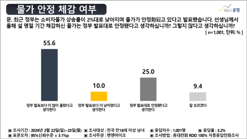 펜앤마이크가 여론조사 전문기관 여론조사공정(주)에 의뢰해 2월 22일과 23일 이틀간 전국 만 18세 이상 남녀 1,001명을 대상으로 조사한 결과, ‘정부 발표보다 더 많이 올랐다고 생각한다’는 응답이 55.6%로 집계됐다.