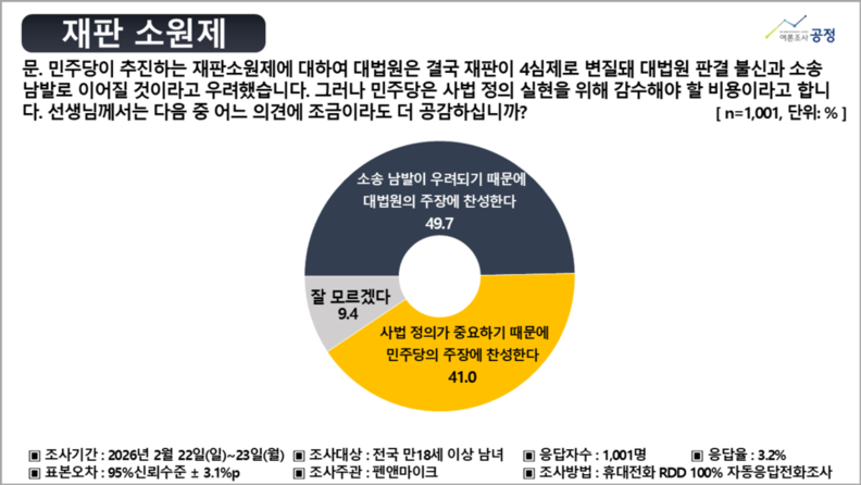 더불어민주당이 추진 중인 재판소원제를 둘러싸고, 소송 남발 우려를 제기한 대법원 주장에 찬성한다는 응답이 민주당 주장보다 오차범위 밖에서 높게 나타났다.