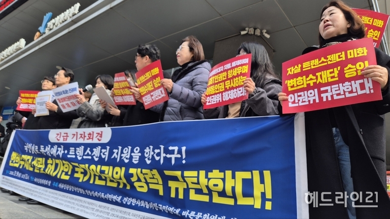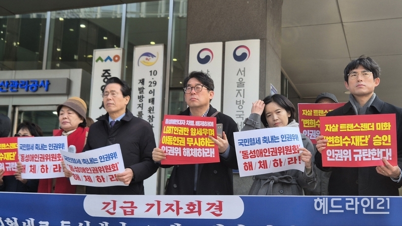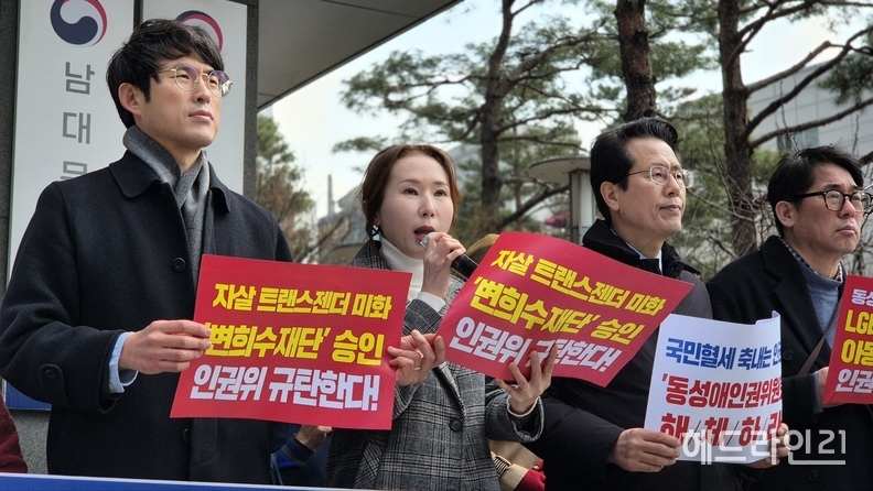 참석자들은 인권위가 지난 3월 5일 상임위원회를 통해 ‘변희수 재단’ 설립을 승인한 점을 문제 삼았다. 변희수 재단은 군 복무 중 성전환 수술을 받은 뒤 강제 전역 처분을 받았던 고(故) 변희수 하사의 뜻을 기리기 위해 성전환 수술 지원 등을 목적으로 추진된 단체다.