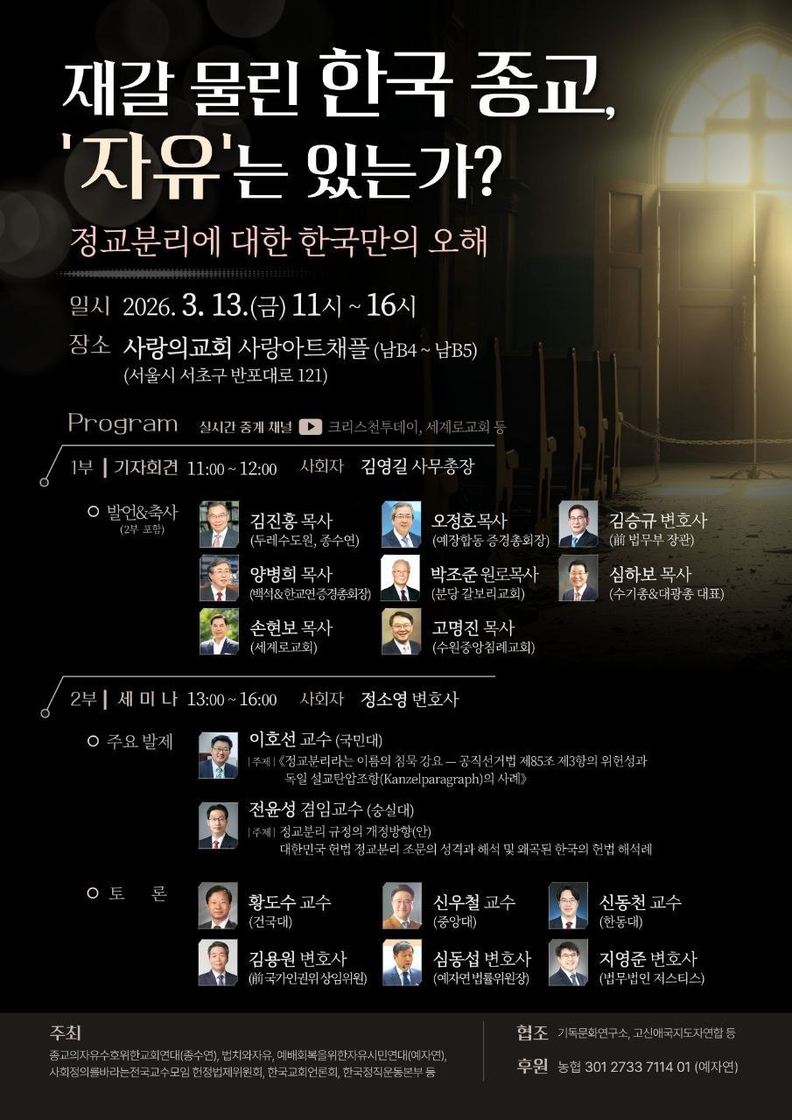 이어 이호선 국민대 법무대학원 교수와 전윤성 숭실대 국제법무학과 겸임교수가 발제를 맡아 정교분리 원칙의 헌법적 의미와 법적 적용 문제를 다룰 예정이며, 황도수 건국대 교수와 김용원 변호사 등 법조계와 학계 인사들이 토론에 참여해 종교 자유 보호와 법적 대응 방안을 논의할 것으로 전해졌다.