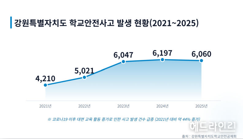 공제회가 분석한 ‘2025년 학교안전사고 통계’에 따르면, 지난해 도내 학교에서 발생한 사고는 총 6,060건으로 집계됐다. 이는 2021년 4,210건 대비 약 44% 급증한 수치로, 등교 정상화와 대면 활동 증가에 따른 상승세가 뚜렷하게 나타났다. 공제회는 사고 발생의 원인을 ‘언제, 어디서, 어떻게’의 관점에서 분석하여 향후 안전 관리의 핵심 방향을 제시했다.