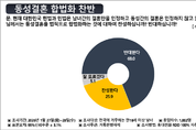 동성 간 결혼을 법적으로 허용하는 방안을 둘러싸고, 국민 다수는 제도 도입에 부정적인 입장을 보인 것으로 나타났다. 여론조사공정이 거룩한방파제통합국민대회의 의뢰로 실시한 ‘차별금지법 관련 국민 인식 조사’ 결과, 동성결혼 합법화에 대해 ‘반대한다’는 응답이 69.0%로 집계됐다. ‘찬성한다’는 응답은 25.9%였고, ‘잘 모르겠다’는 응답은 5.1%로 나타났다. 연령대별 응답을 보면 전 세대에서 반대 의견이 우세했다. 만 18~20대에서는 반대 57.5%, 찬성 35.6%로 반대가 앞섰고, 30대 역시 반대 67.4%, 찬성 30.4%로 유사한 흐름을 보였다. 40대에서도 반대 60.7%로 과반을 기록했다. 50대(75.6%), 60대(73.5%), 70세 이상(77.3%)에서는 반대 비율이 더욱 높아, 연령이 높아질수록 동성결혼 합법화에 대한 거부감이 강화되는 경향이 나타났다. 지역별로는 서울(64.2%)과 경기·인천(69.3%)을 비롯해 대전·세종·충남·충북(76.1%), 광주·전남·전북(75.4%), 대구·경북(74.6%) 등 대부분 지역에서 반대 응답이 과반을 넘겼다. 부산·울산·경남(64.7%)과 강원·제주(56.8%)에서도 반대 의견이 우세했다.